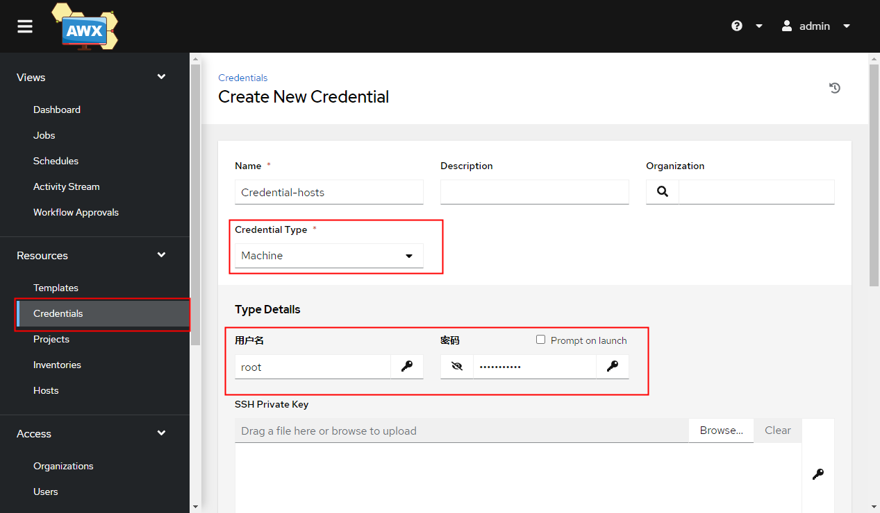 输入用户名和密码,登录到 AWX 后台管理界面