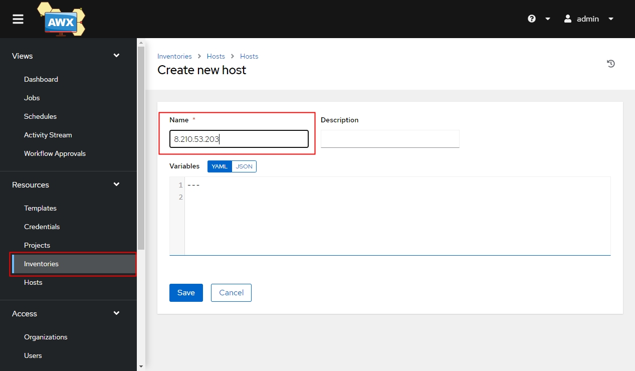 登录 AWX,创建【清单】,然后在清单中增加【主机】
