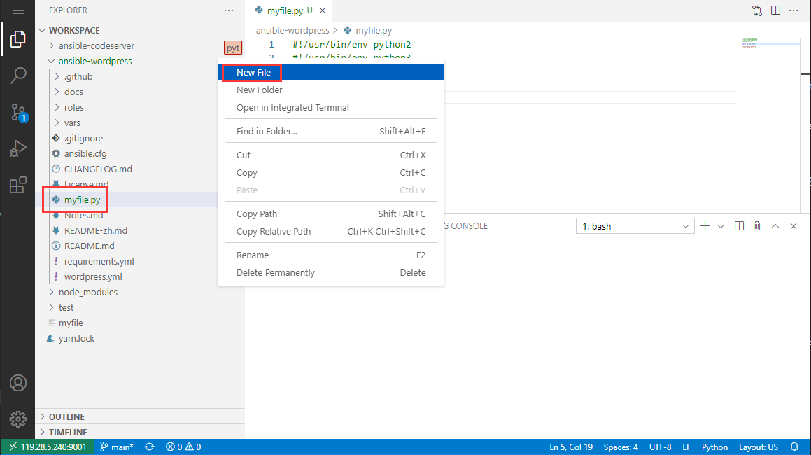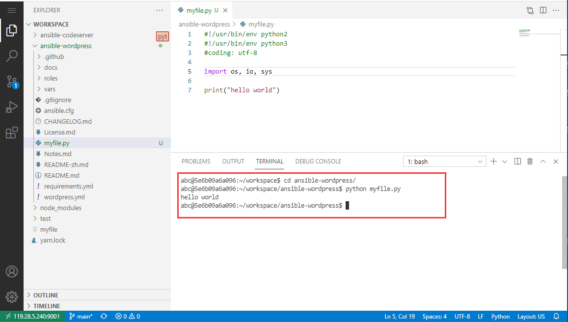 下面以 Python 开发为范例,介绍如何使用 code-server: