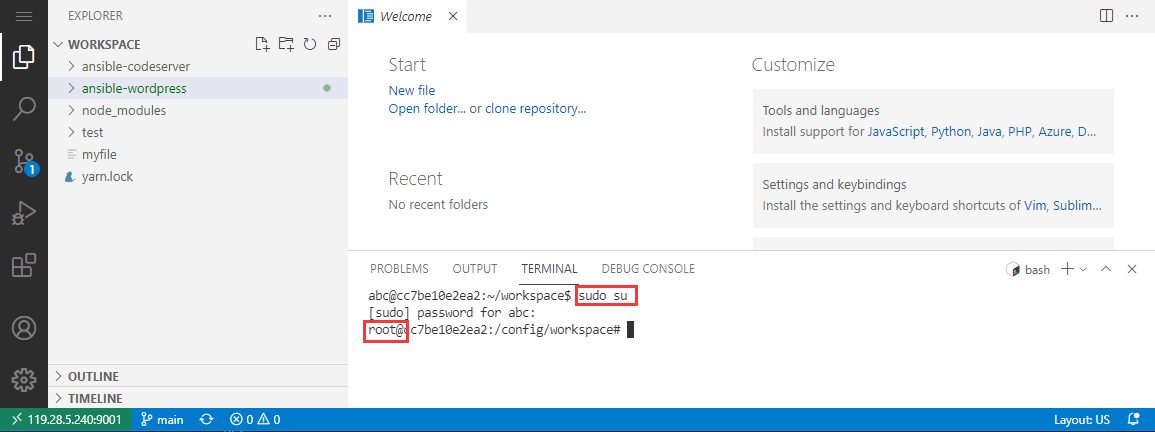 sudo su切换为 root 用户密码为 code-server 控制台登录密码