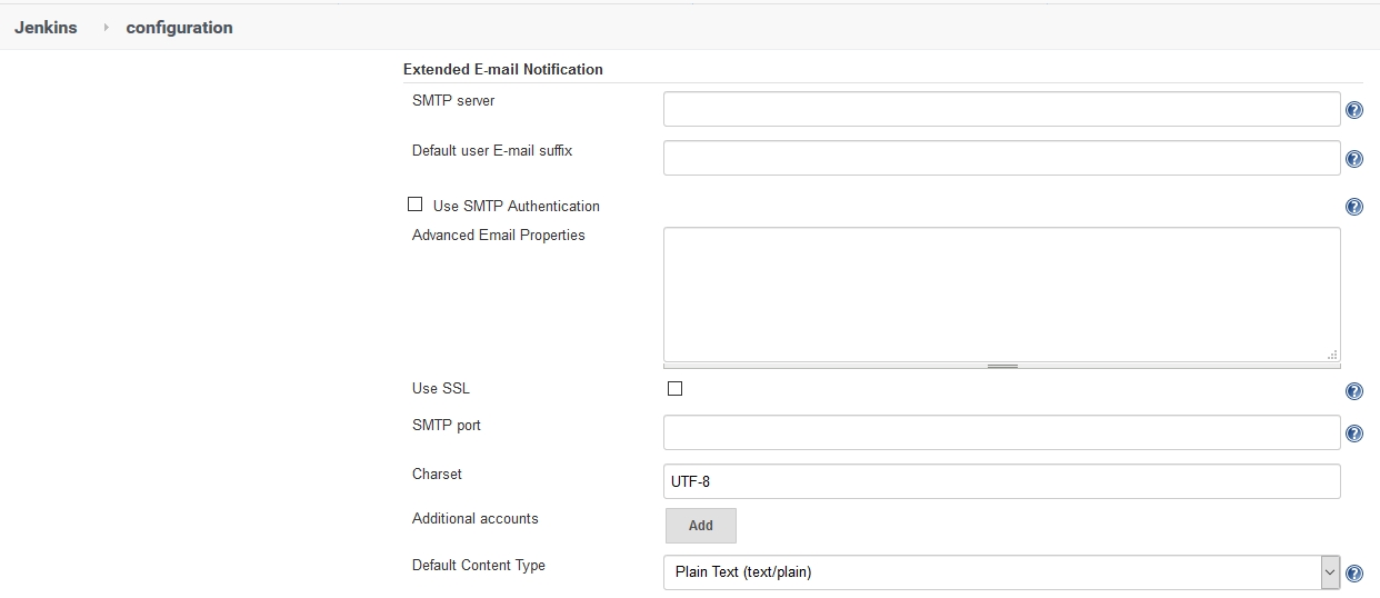 登录 Jenkins 控制台,依次打开:【Manage Jenkins】>【Configure System】,填写 SMTP 参数