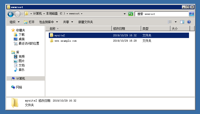 使用 远程桌面 连接服务器,在 C:\wwwroot 下新建一个网站目录,假设命令为“mysite2”