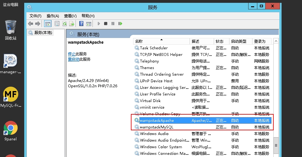 远程桌面到服务器,点击 WAMP 图标,选择 Apache 或 MySQL,然后点击【Restart】,就可以重启服务