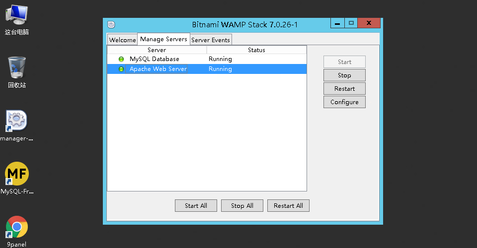 9panel 远程桌面登录到 Windows 服务器,查看 WAMP 是否正常运行(图标为绿色),点击【Restart】按钮测试可用性。如果桌面右下角没有 WAMP 图标,请重启服务器后再查看。