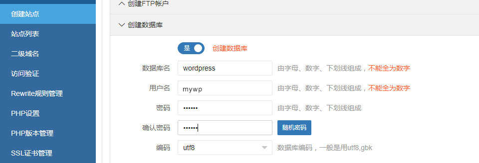 创建数据库名、用户名和密码(Wordpress安装的时候不能自行生成数据库,因此在此处先创建)