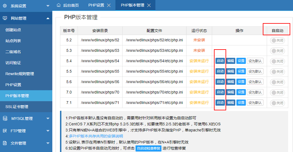 网站管理->PHP版本管理,选一个版本点击“启动”按钮