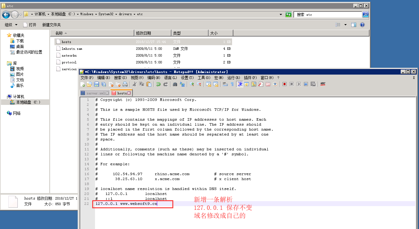 C:\Tomcat8.5\conf\server.xml找到默认<Host>段,如下图所示 在</Host>下面添加虚拟主机配置,修改对应的域名和网站路径