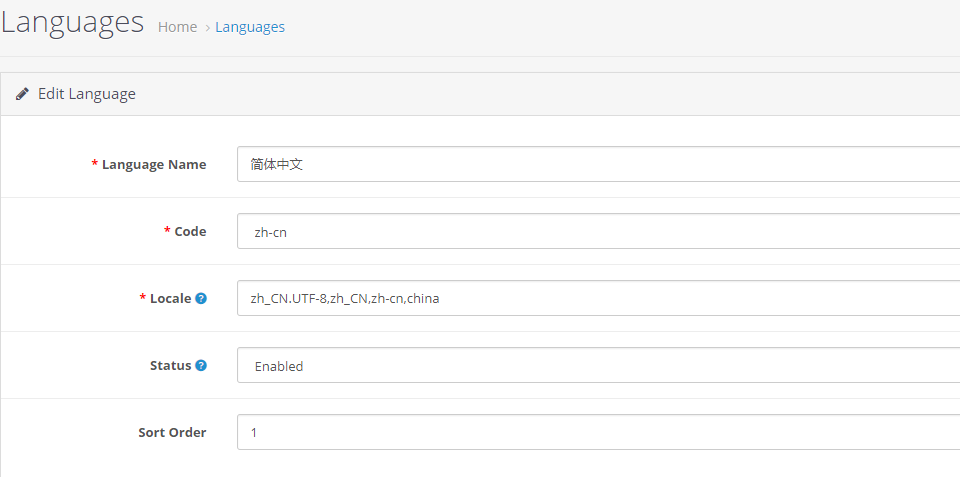 登录 OpenCart,打开【System】>【localization】>【languages】,增加一个语言并填写配置信息
