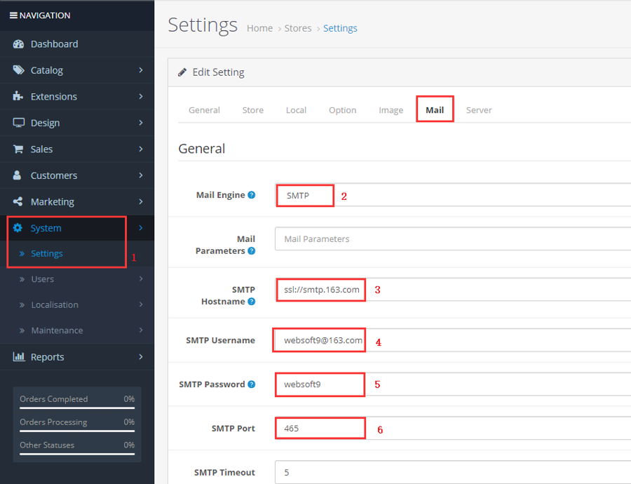 登录到 OpenCart 后台,完成 SMTP 参数设置