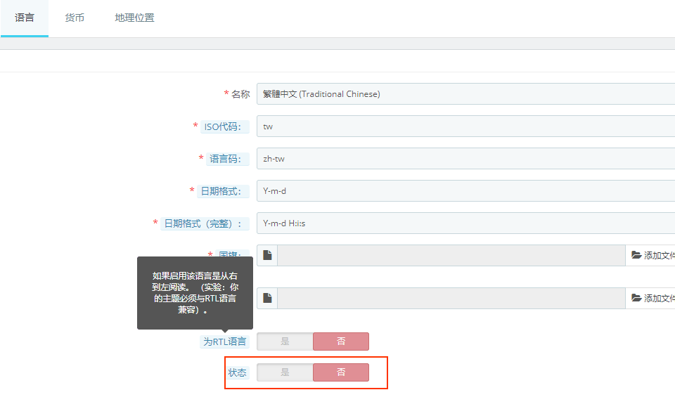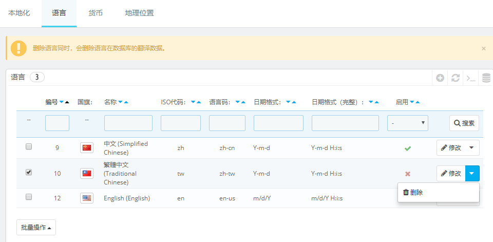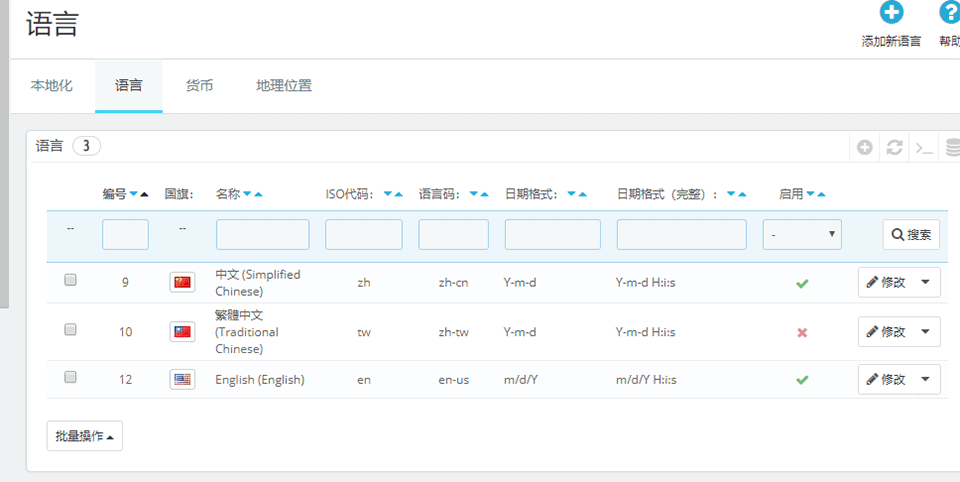 登录Prestashop后台,依次打开:【国际】>【本地化】>【语言】,编辑您需要的语言