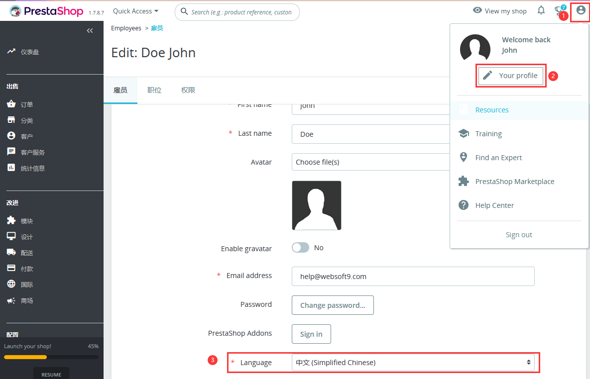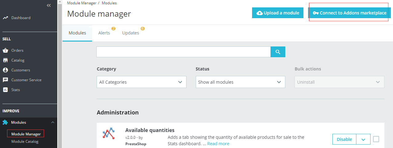 安装 PrestaShop 后,建议把你安装的 PrestaShop 系统与 PrestaShop 官方的 Marketplace 资源进行在线连接,这样便可以在线使用 Marketplace 上的大量资源