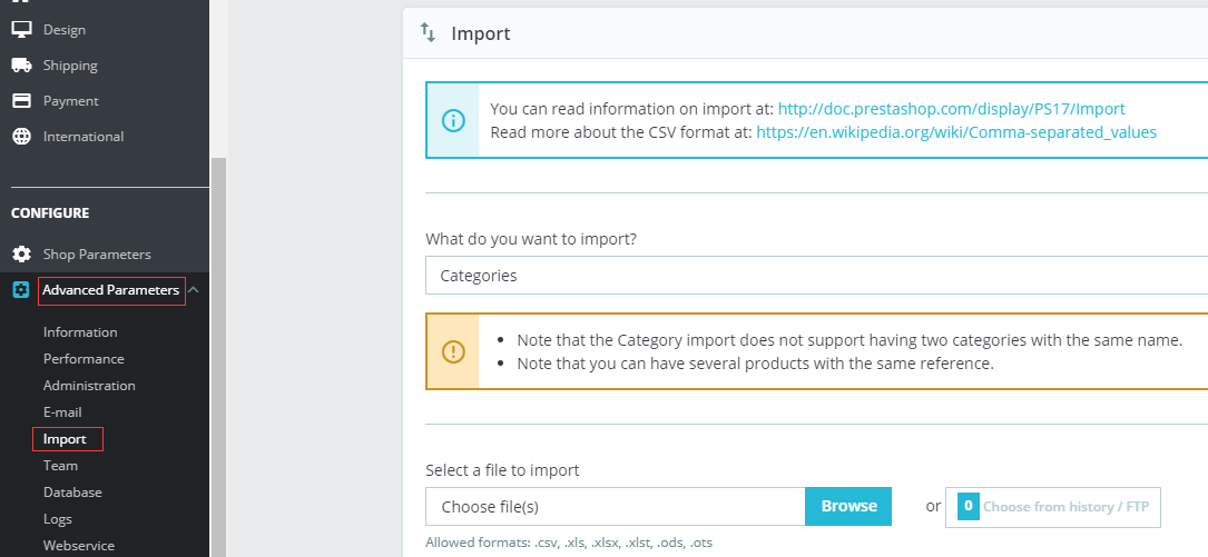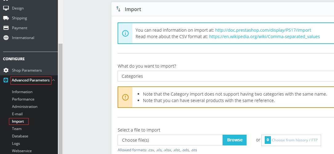 登录 PrestaShop 后台,打开:【Advanced Parameters】>【Import】,导入所需的数据