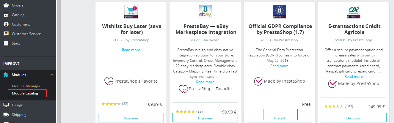 登录 PrestaShop 后台,依次打开:【Modules】>【Module Catalog】,找到所需的插件,点击【Install】开始安装