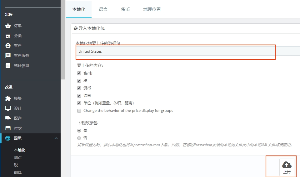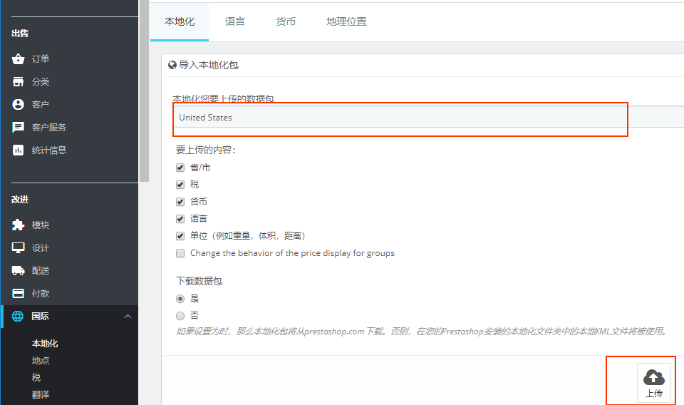 登录Prestashop后台,依次打开:【国际】>【本地化】,进入设置界面