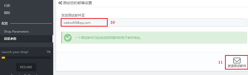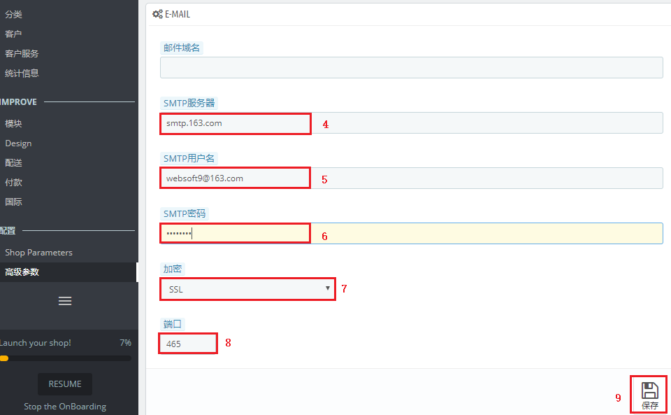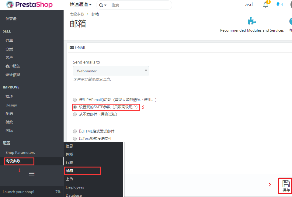 登录到 PrestaShop 后台,完成 SMTP 参数设置