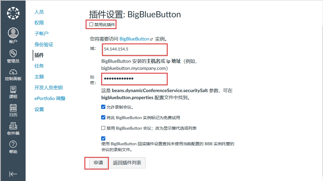 在插件安装页面,去掉勾选【禁用此插件】,输入相关引导信息,点击【申请】
