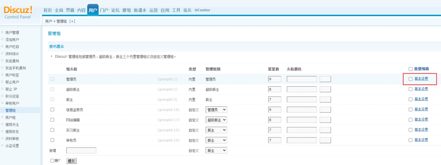 1.进入后台,选择【用户】选项,在【管理者】中选择相应用户组,进入基本设置