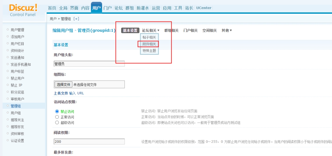 2.选择【论坛相关】,选中【附件相关】