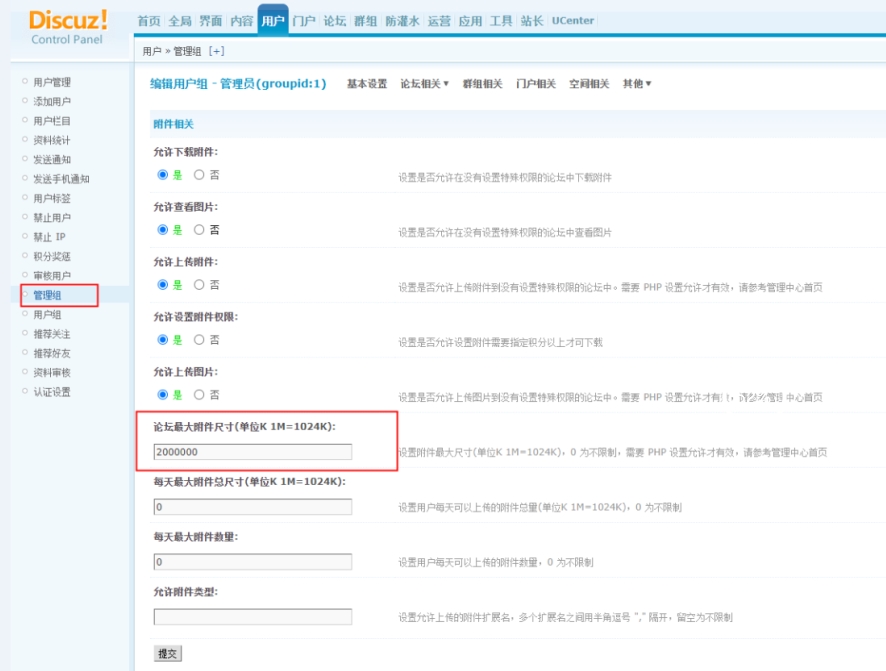 如果 PHP 上传参数已经足够大,但 Discuz 用户上传大小无法满足需求,请通过如下的方式进行修改: