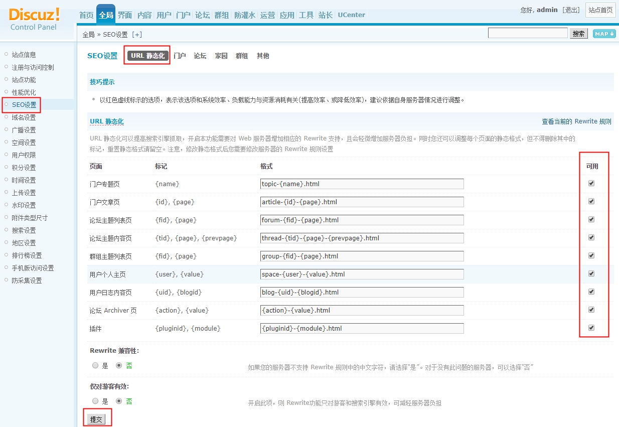网站安装完成后,登录进入后台,在全局>SEO优化设置>将要设置的页面勾选上,然后提交;