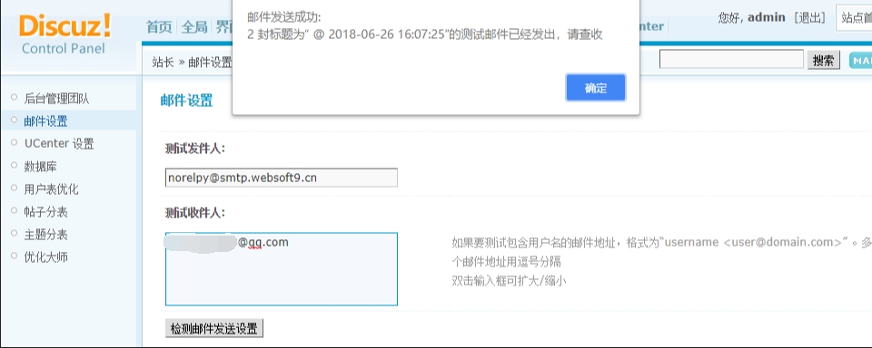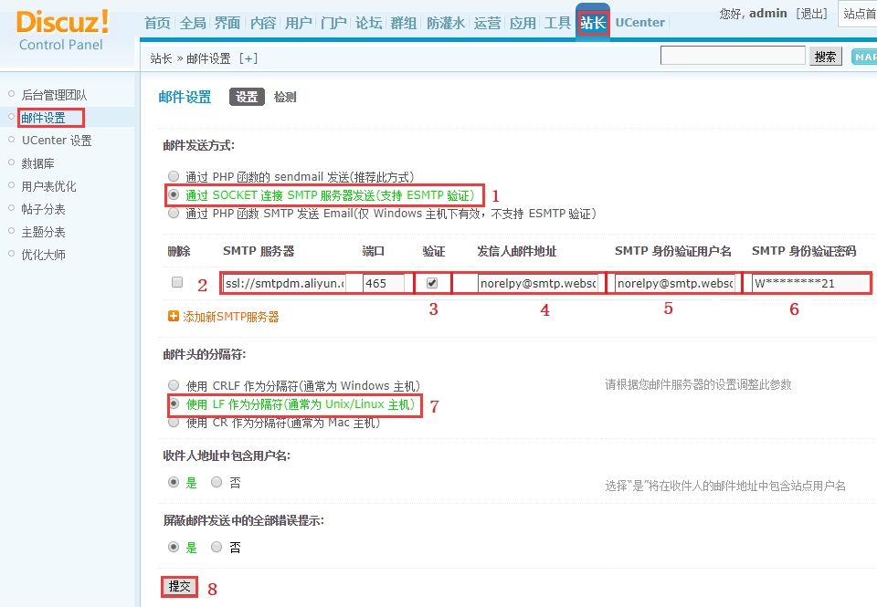 进入 Discuz 后台,打开:【站长】>【邮件设置】,仔细填写 SMTP 参数项