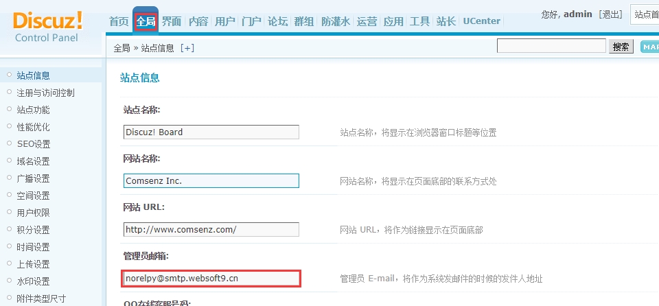 在 Discuz 后台,打开【全局】>【站点信息】,设置全局管理员邮箱,尽量和 SMTP 发件人邮箱保持一致