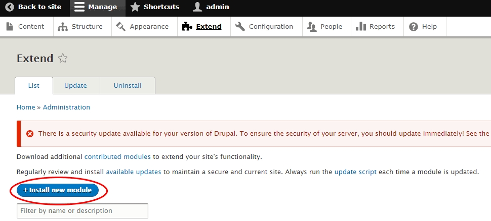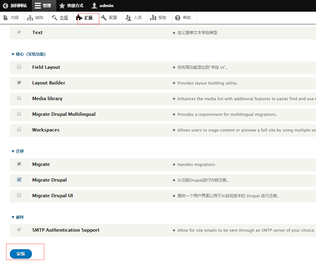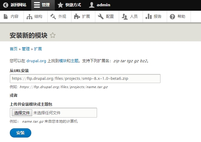 登录 Drupal 后台,打开安装扩展的界面