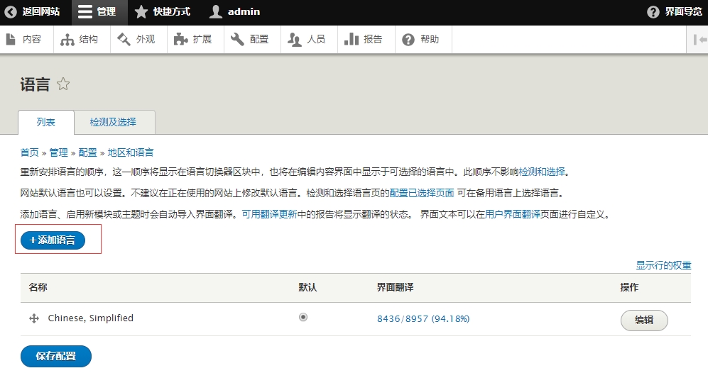 登录 Drupal,在后台 【管理】>【配置】>【地区和语言】中安装语言