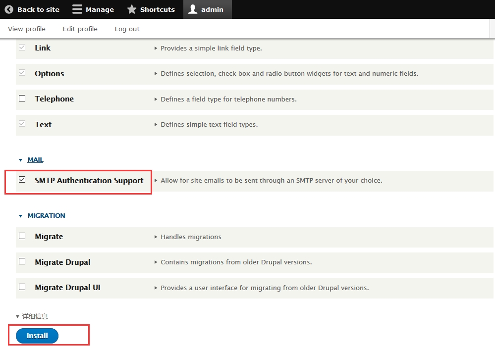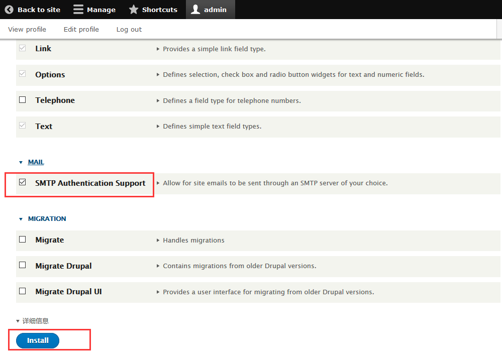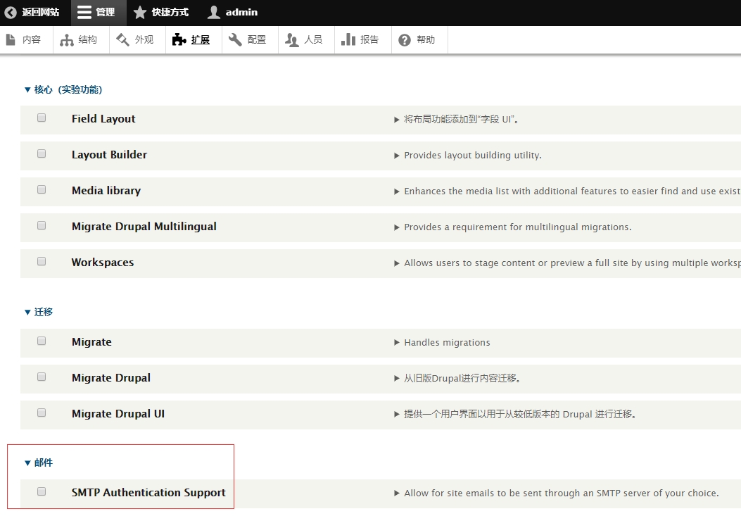 打开:【管理】>【扩展】,找到【SMTP Authentication Support】,点击【Install】完成最终安装步骤