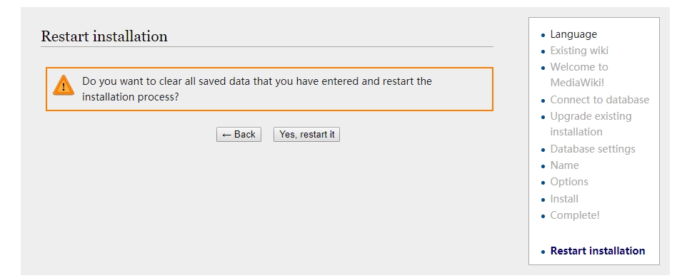本地浏览器访问: http://服务公网IP/mw-config/index.php?page=Restart&lastPage=Install ,开始重装