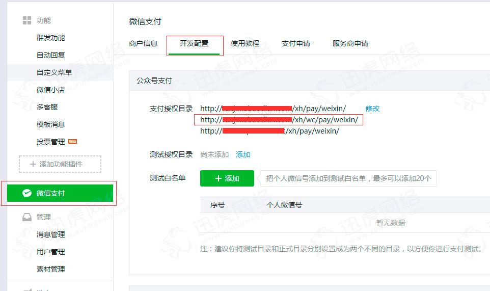 添加授权支付目录在微信公众平台(https://mp.weixin.qq.com)点击-微信支付-开发配置,设置授权支付目录 微信支付插件的授权支付目录为: