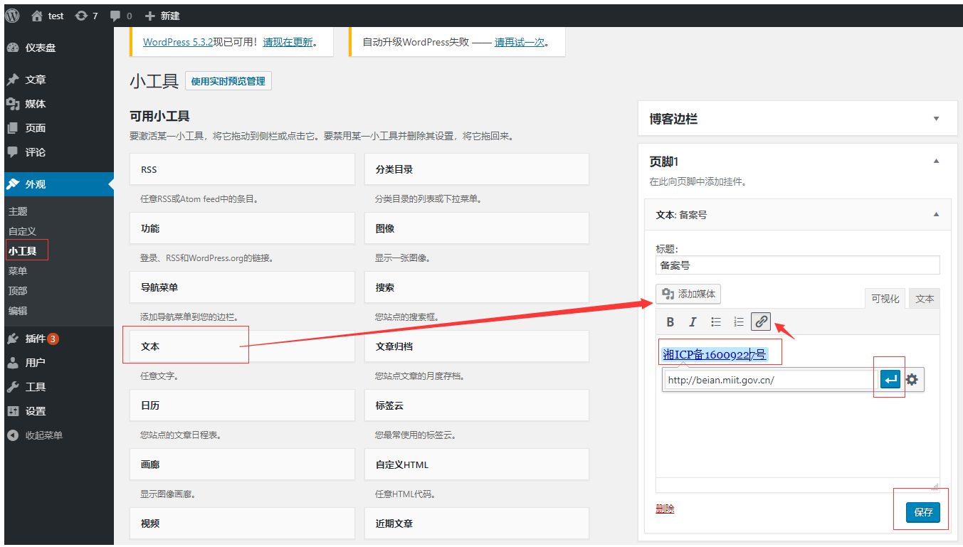 从左侧的【可用小工具】中拖拽一个【文本】小工具到右侧的【页脚1】