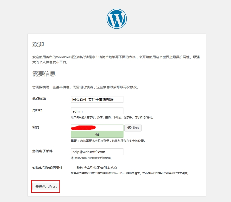 设置您的管理员账号、密码和邮箱, 点击“安装WordPress”;