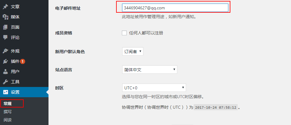 登录 WordPress后台-设置-常规,设置好需要用于发件的邮件地址