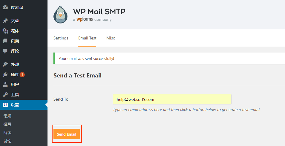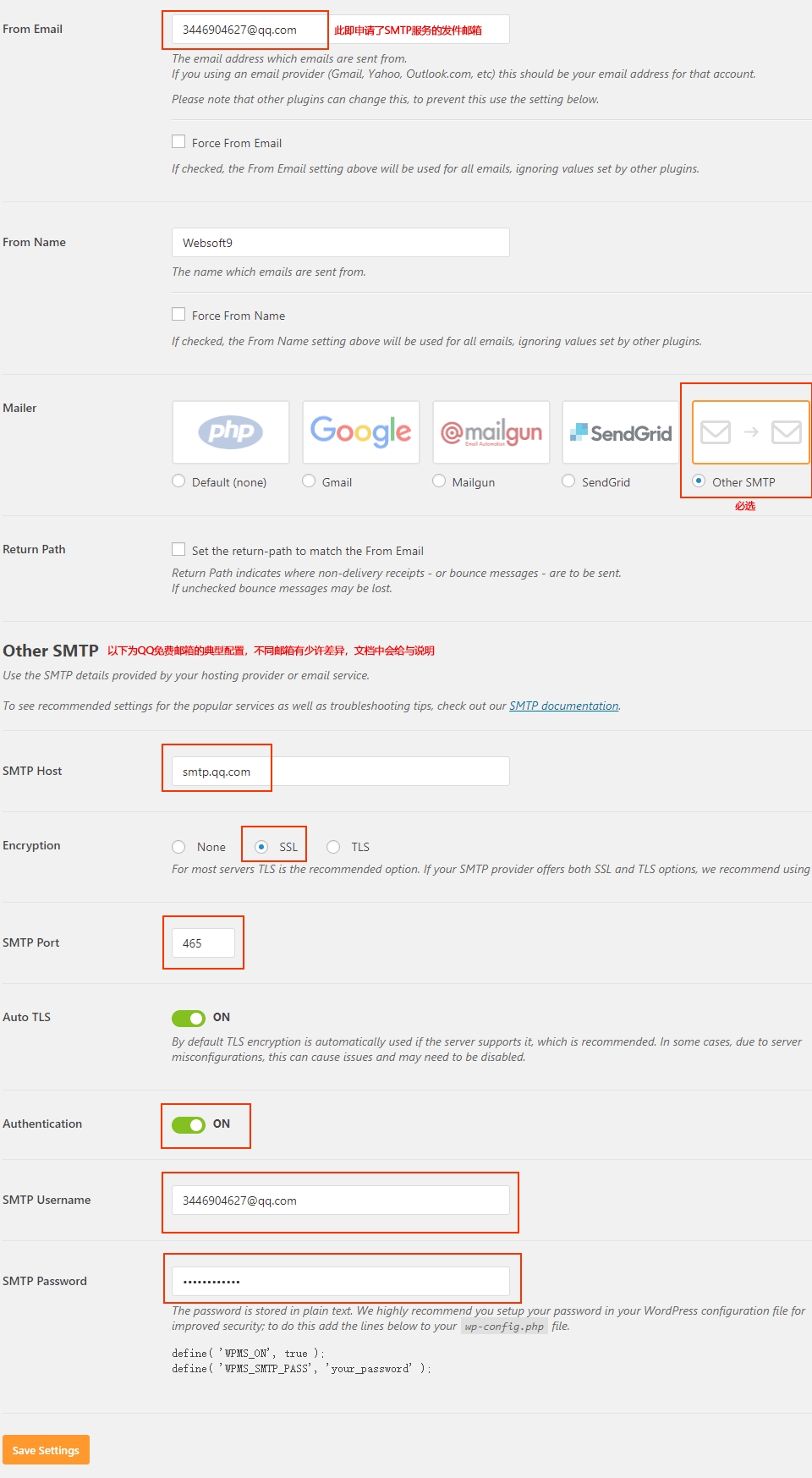后台-设置-Email,配置WP Mail SMTTP 插件的参数