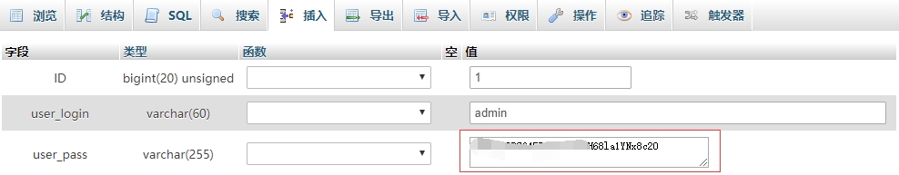 登录 phpMyAdmin,并找到你的网站数据库下的 wp_user 表