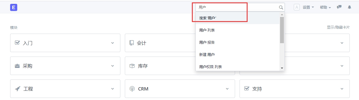 ERPNext 顶部菜单中提供了搜索框,用于快速检索并进入 ERPNext 所有的功能