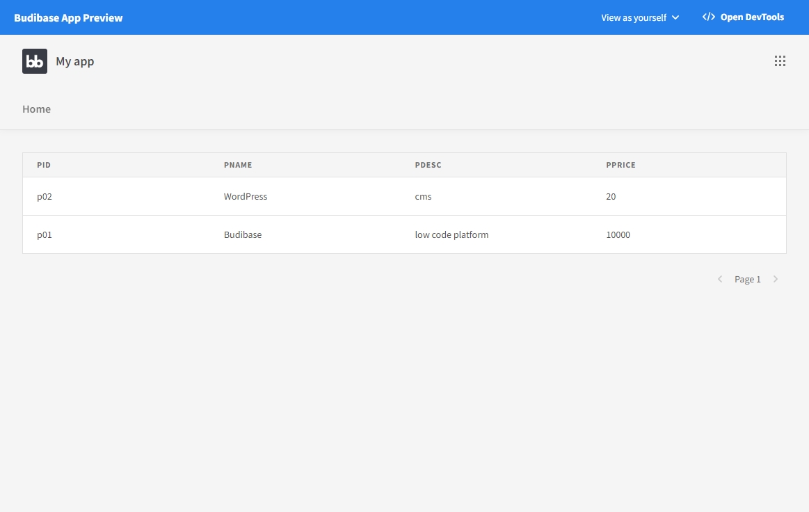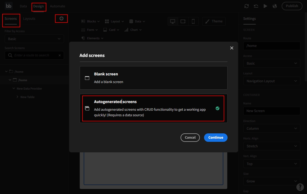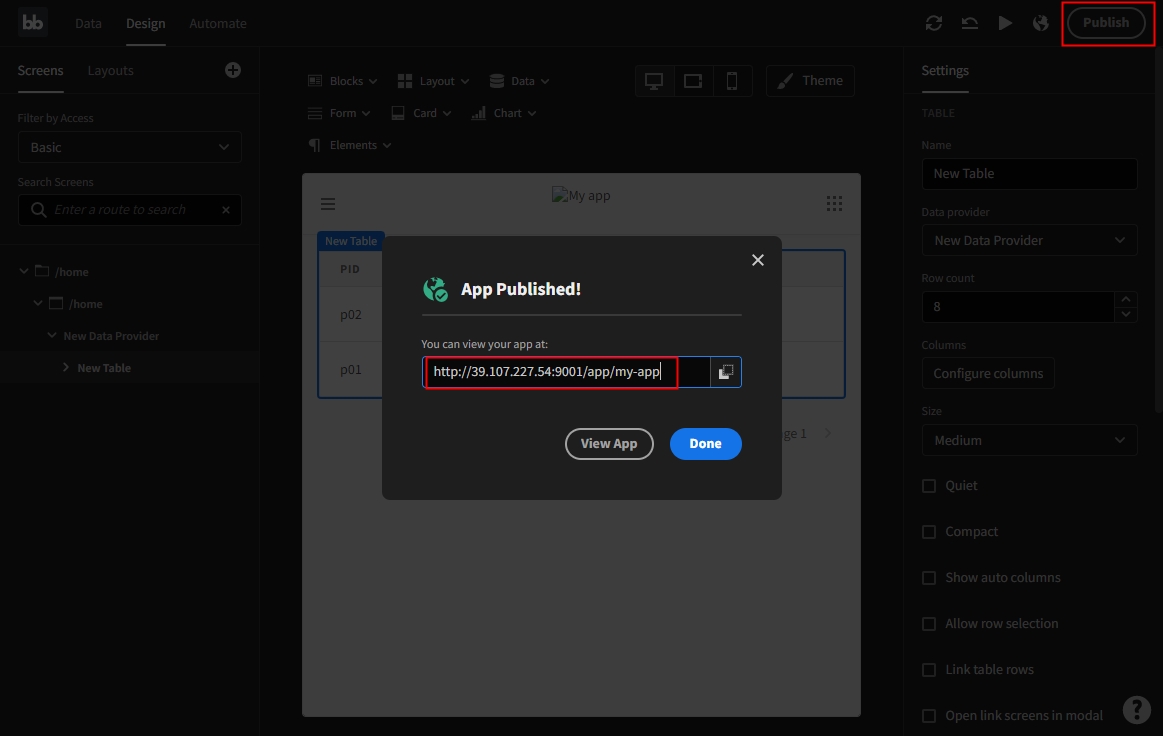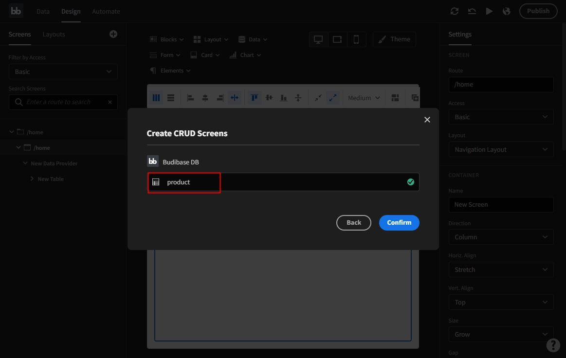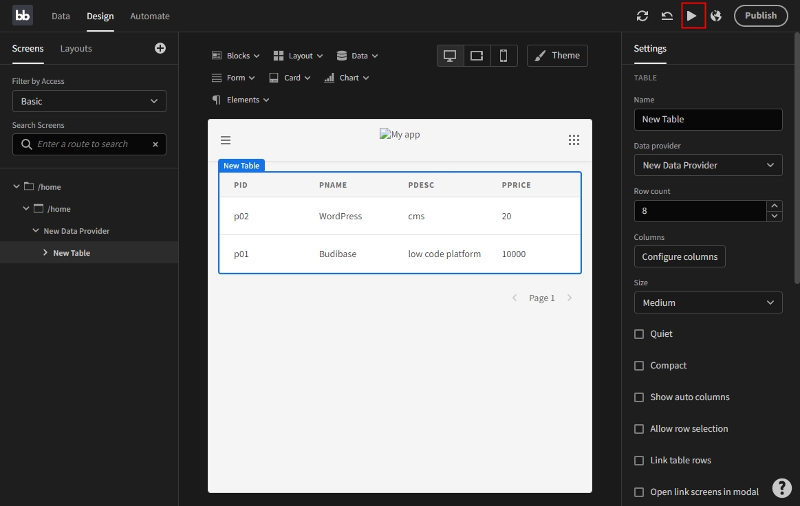 Budibase 还支持基于数据表自动构建页面,生成基于数据表的增删查改的页面,实现数据的CURD,参考自动生成页面