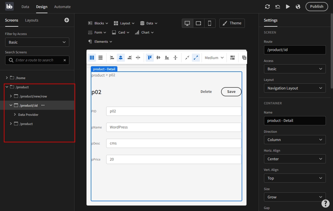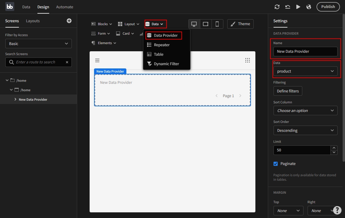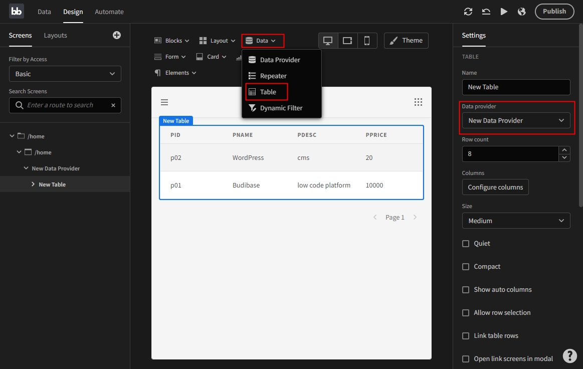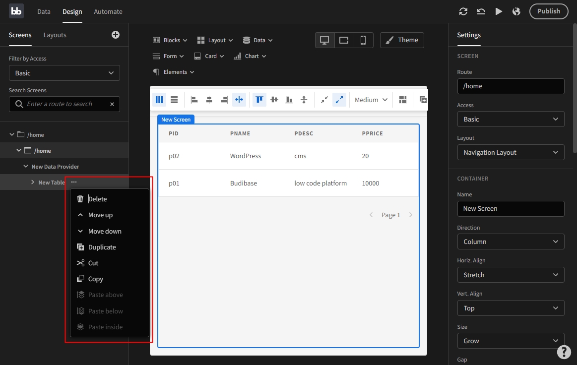 Design: 页面设计,Budibase 提供丰富的控件来构建页面,数据控件用来做数据绑定和呈现
