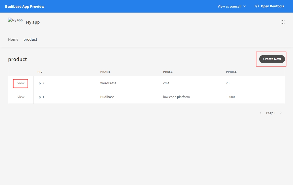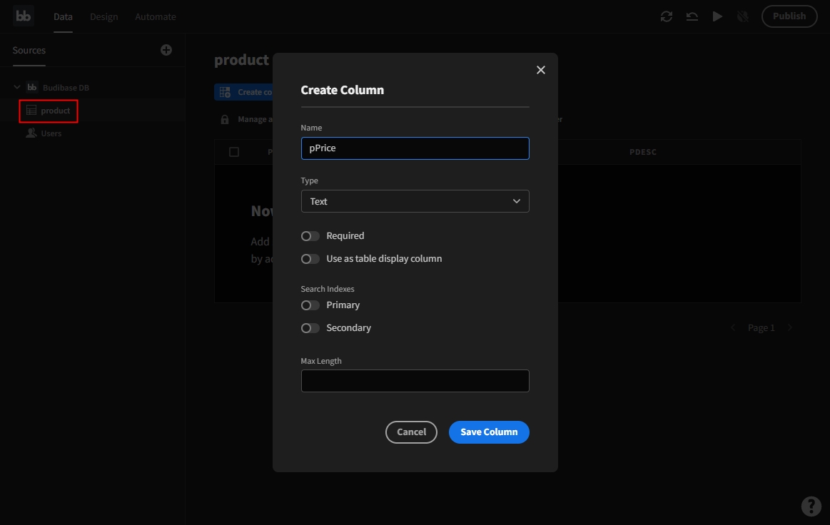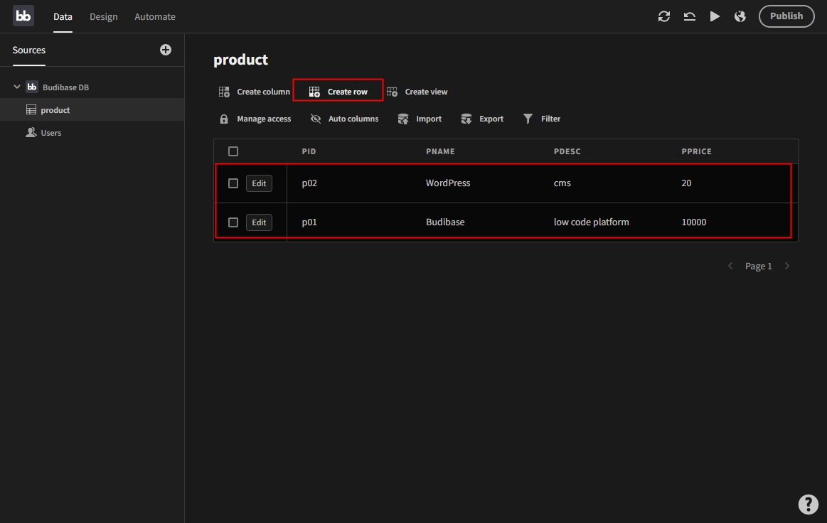 基于 Budibase 进行数据建模,新建表 Product , 通过 create column 和 create row,建立表结构,并添加数据记录