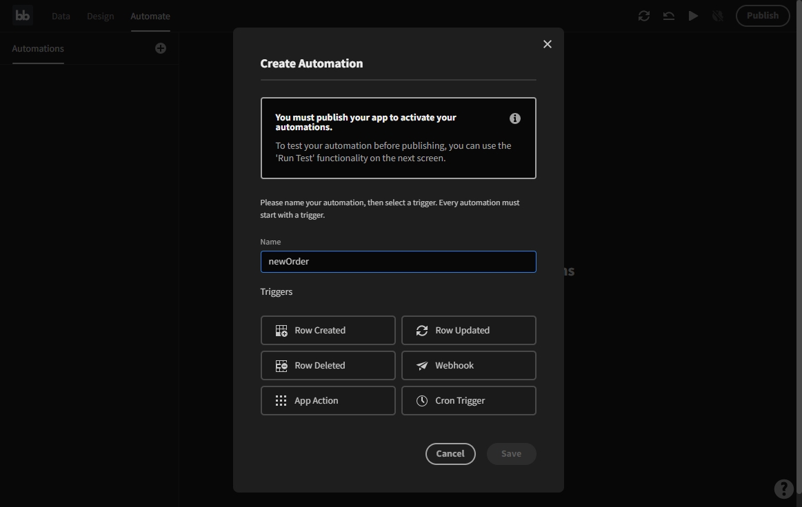 Automate: 用来设计流程的自动化执行,触发条件支持数据变化、Webhook、App Action 及 Cron