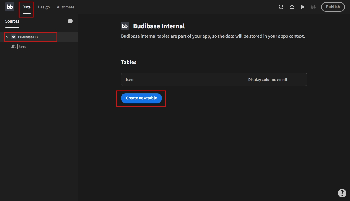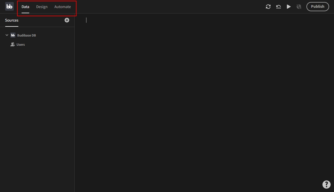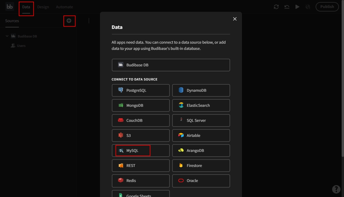 Data: 管理数据源,支持 Budibase 内部建表进行数据建模,也支持连接外部数据源