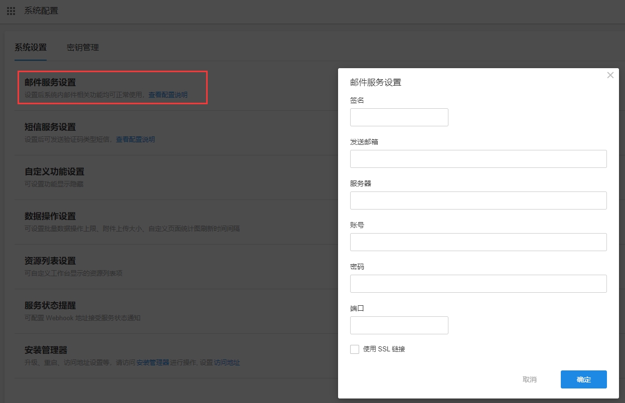 登录明道云,打开右上角用户图标下的【系统配置】,点击【邮件服务设置】开始配置