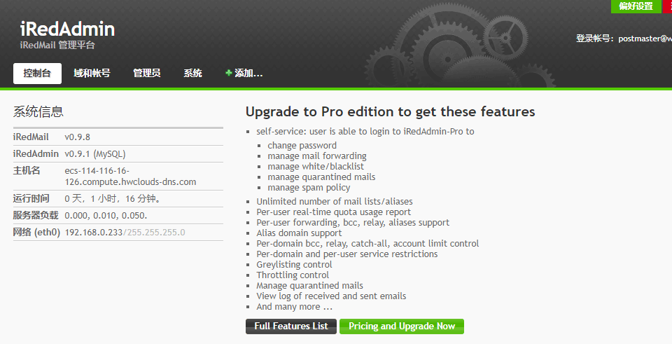 在邮件服务器的配置完成之后,就可以通过浏览器访问邮箱管理端了。系统默认生成了一个账号:postmaster@域名