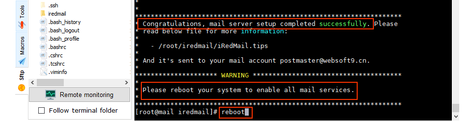 邮箱配置完成之后,请使用SFTP到服务器,下载 /root/iRedMail/iRedMail.tips文件,它包含了: