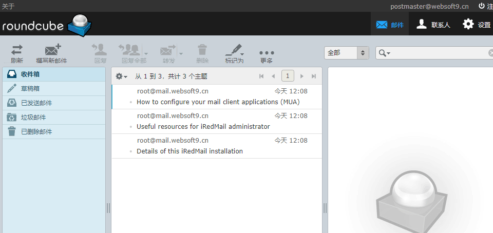 在邮件服务器的配置完成之后,就可以通过浏览器访问邮箱了。系统默认生成了一个账号:postmaster@域名