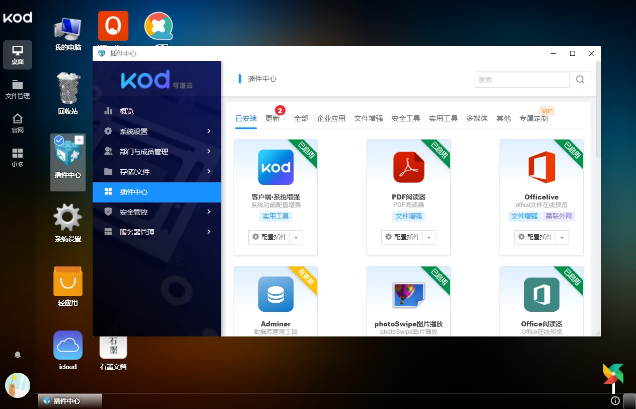 插件管理:点击桌面的【插件中心】,管理系统插件