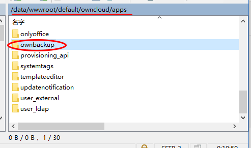 上传到 ownCloud 应用目录:/var/lib/docker/volumes/owncloud_owncloud/_data/apps,并通过chown 命令,改变扩展目录(如 ownbackup)的拥有者和关联组用户为 www-data