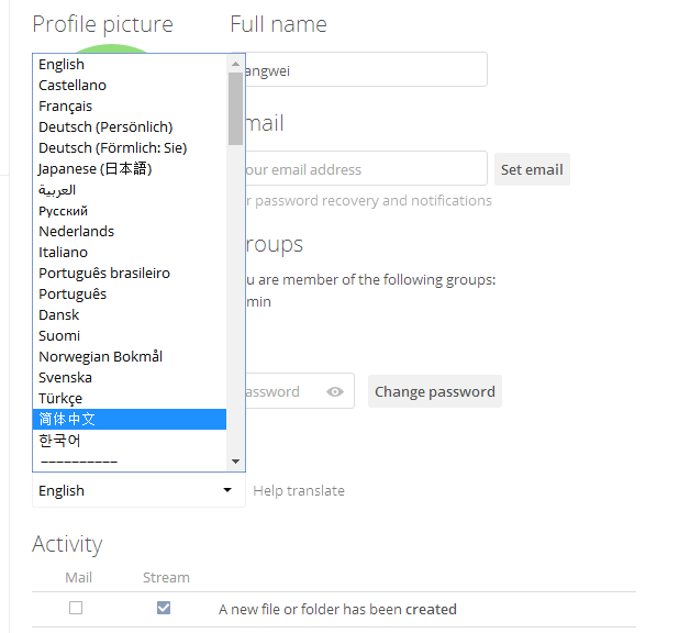 登录 ownCloud,在后台 【Personal】>【General】中设置语言