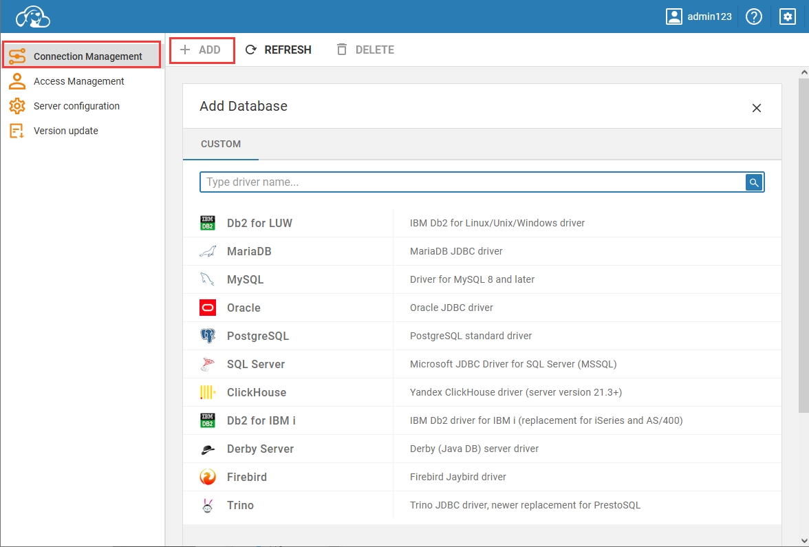 登录 CloudBeaver 控制台,点击右上角【Settings】图标,选择【Administration】>【Connection Management】,添加对应数据库,进行连接管理